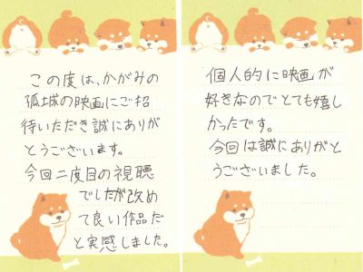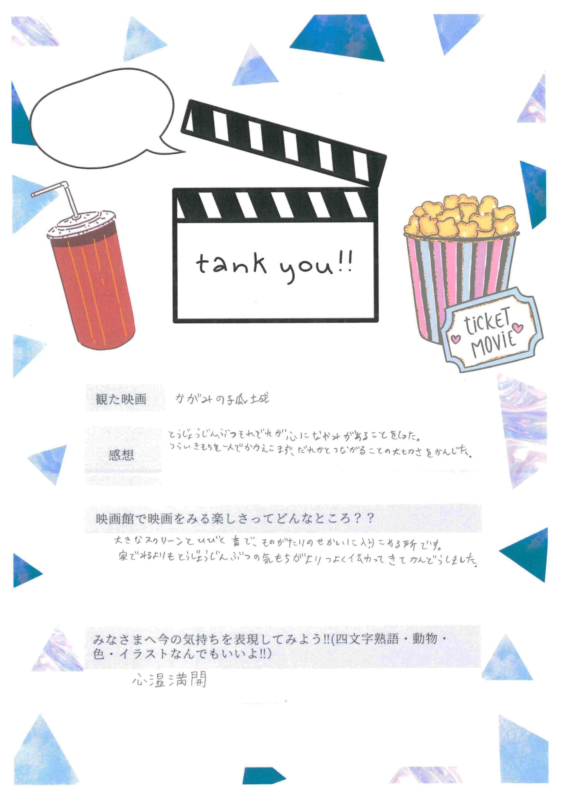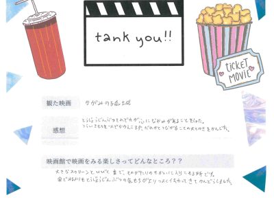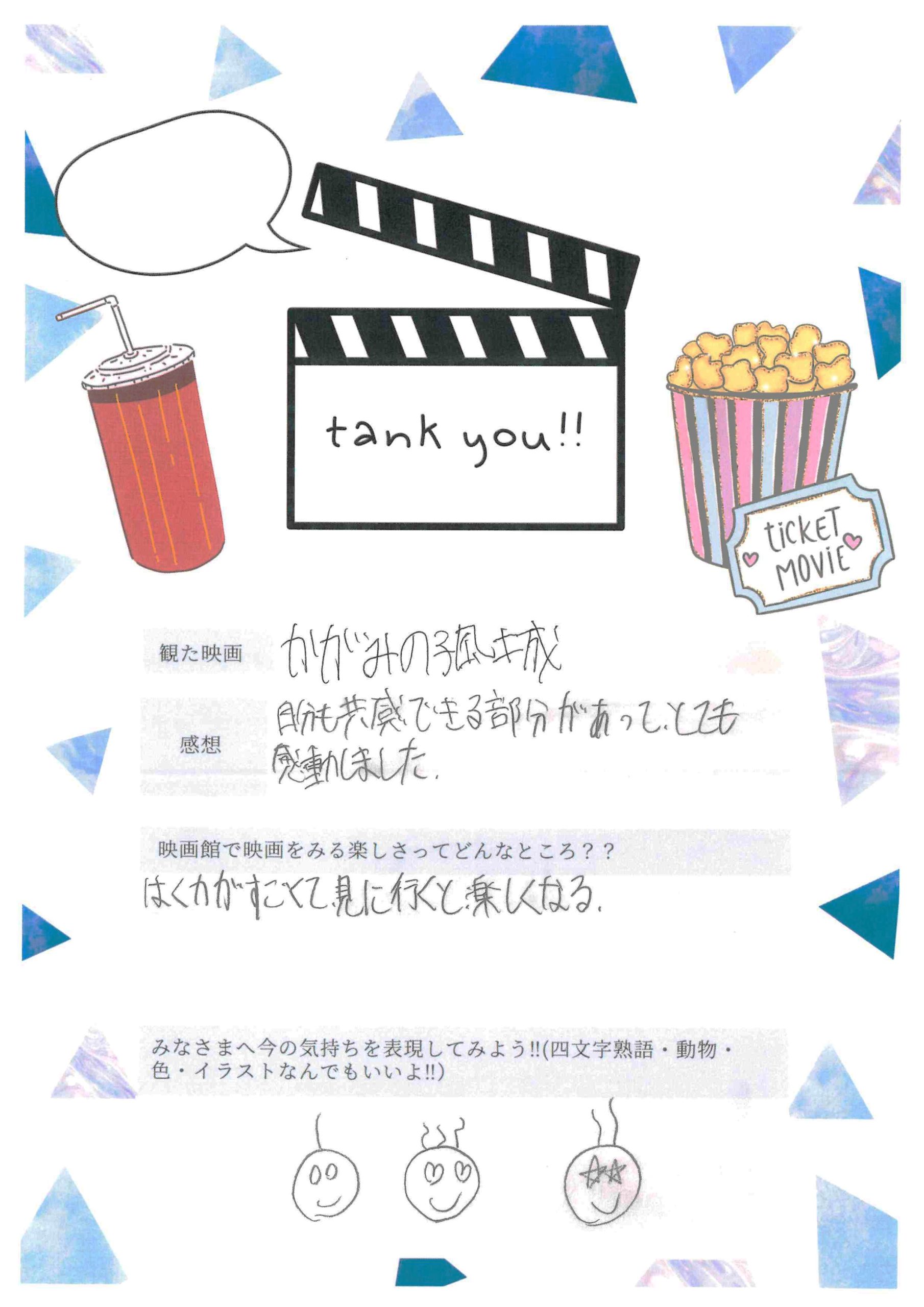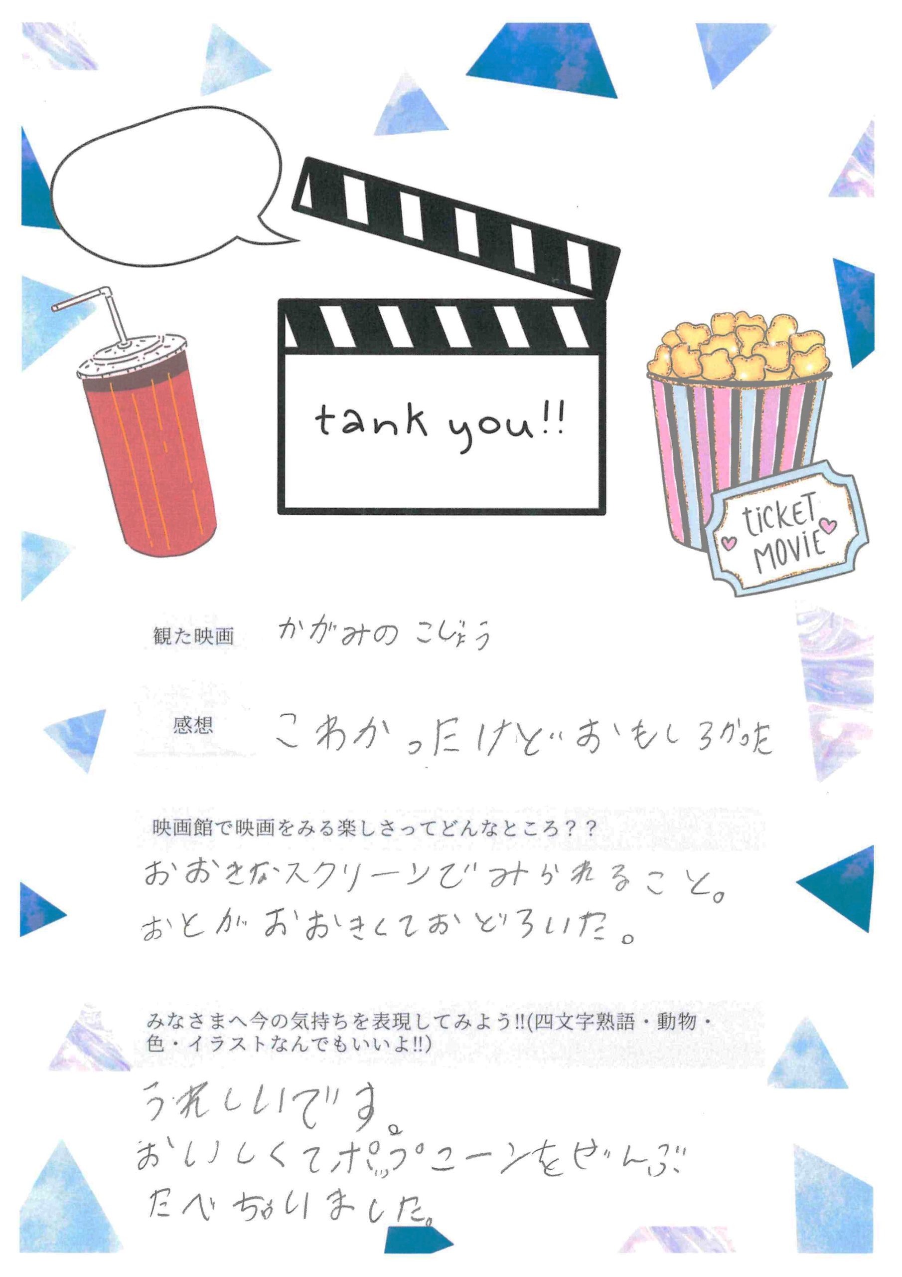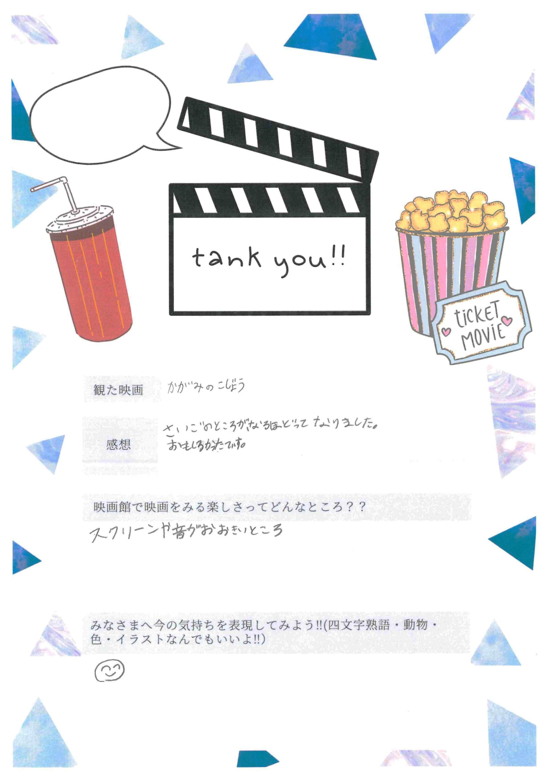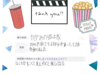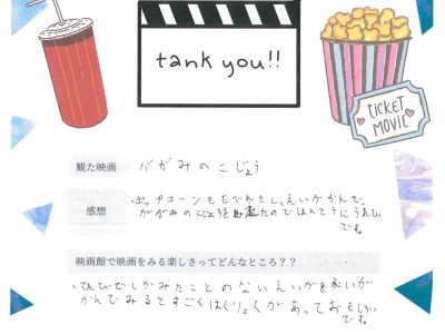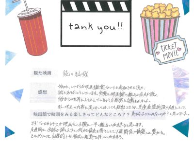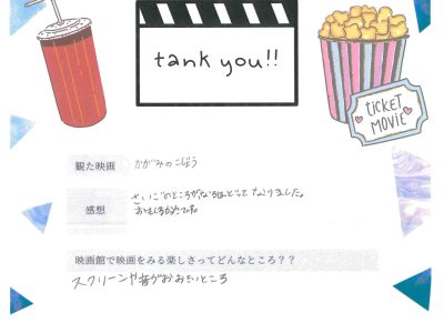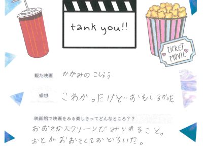 上映終了後、出口で子どもたちをお迎えし、「楽しかったですか?」と問い掛けたところ、「楽しかった」と小さな声で微笑む姿に、こちらも暖かさをもらいました。