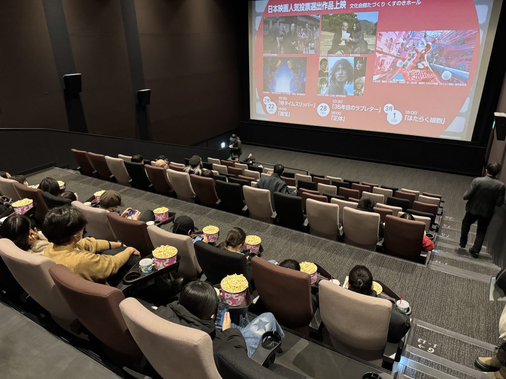 小雪が舞う2/8(日)、今か今かとワクワクした様子で頬を赤くして子どもたちが集まってきました。イオンシネマ シアタス調布の羽藤支配人からポップコーンとジュースを受け取り、SCREEN1 へ向かいます。シアタス調布に来館するのが初めての子どももいて、自分の席を探して、見つけた時は、嬉しそうに着席していました。